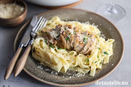 ♥ Når du serverer kylling sammen med Pasta Alfredo er det ekstra viktig at pastaretten ikke blir tørr. Du kan spe med litt ekstra pastavann dersom du synes at det er lite saus i pannen.