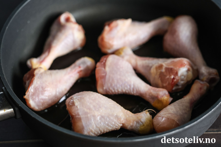 Stek kyllingstykkene i stekepanne med olivenolje. Bruk nokså høy varme og la kyllingstykkene få god stekeskorpe. Ikke stek for mange stykker av gangen. Jeg brukte her 600 g kylling overlår og 600 g kyllingklubber som jeg stekte hver for seg. Dersom du kjøper hele kyllinglår, kan du gjerne skjære dem i to før du steker dem.