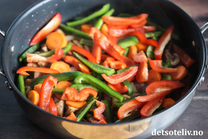 Skjær sopp, gulrot og paprika i grove biter og legg i pannen.