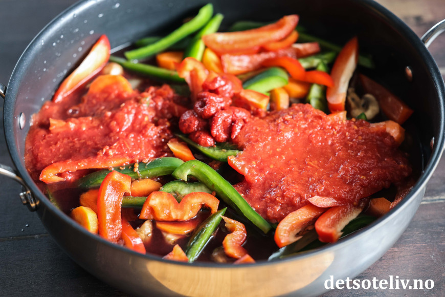 Skjær sopp, gulrot og paprika i grove biter og legg i pannen. Rør om og tilsett vin, hermetiske tomater og tomatpuré. Bland godt sammen. Smak til sausen med litt kvernet salt og pepper. Legg laurbærblad i tomatsausen.