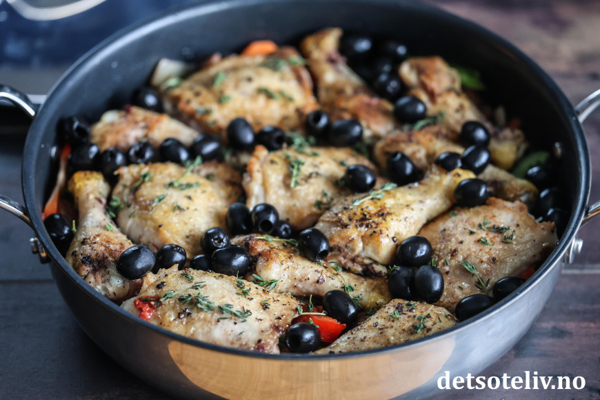 ♥ Jeg valgte her å bruke en traktørpanne og sette den i stekeovnen i ca. 1,5 time. Du kan i stedet la gryten småputre under lokk på ovnsplaten. Bruk i så fall middels varme på platen og beregn ca 1 til 1,5 time til kyllingen er skikkelig mør. Pass på innimellom så gryten ikke koker tørr og spe eventuelt med litt vann eller kyllingkraft.