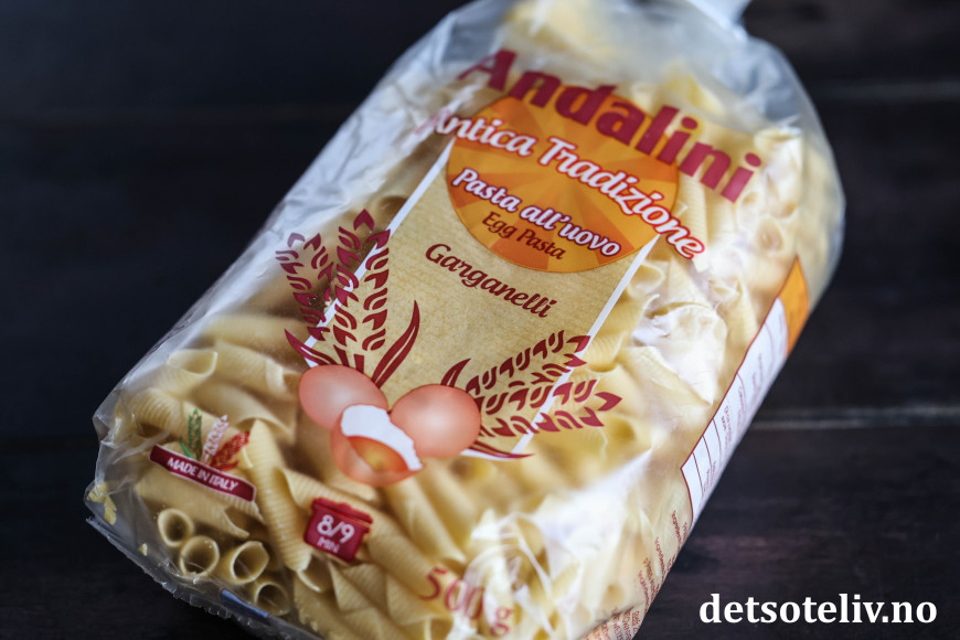 ♥ Jeg synes det er gøy å variere med pasta i ulike fasonger. Jeg brukte denne gangen en variant som kalles for Garganelli.