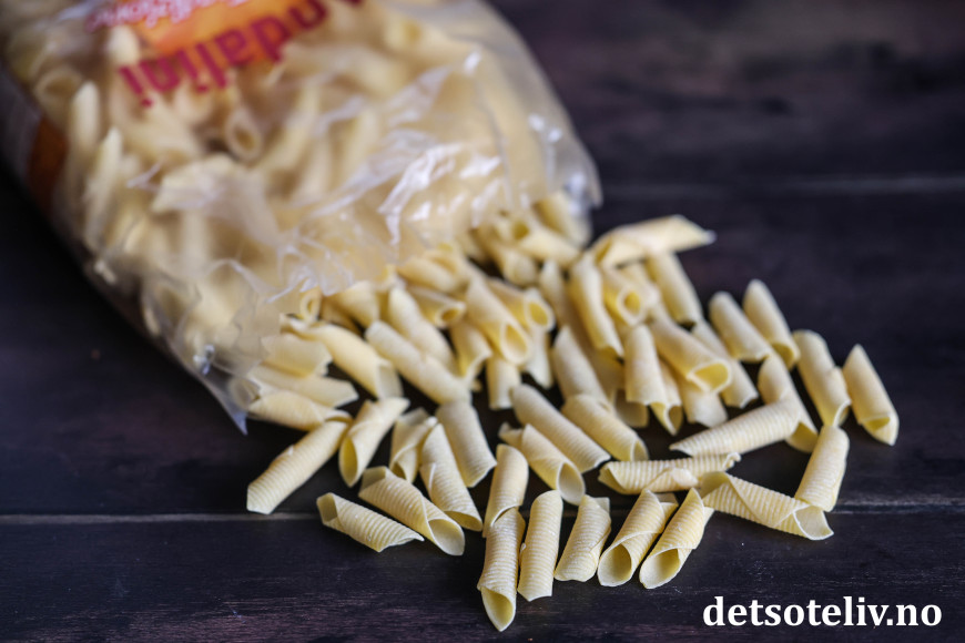 ♥ Jeg synes det er gøy å variere med pasta i ulike fasonger. Her ser du varianten jeg brukte denne gangen, som kalles for Garganelli.