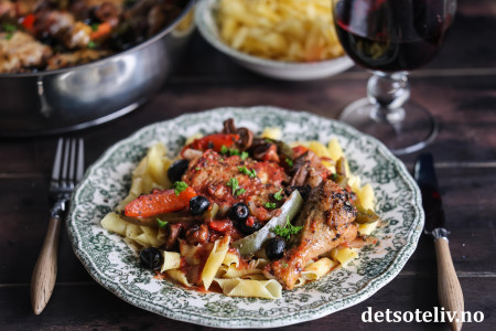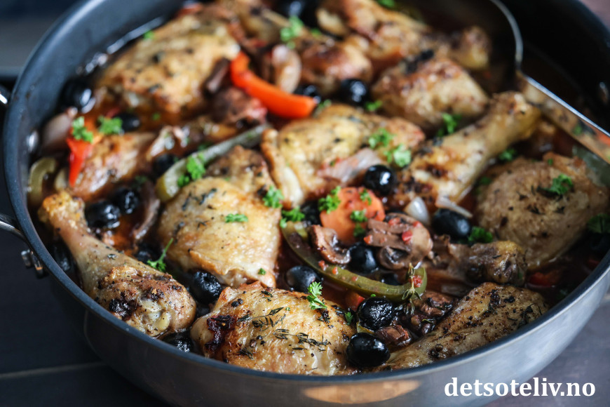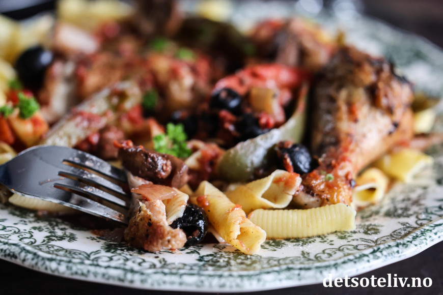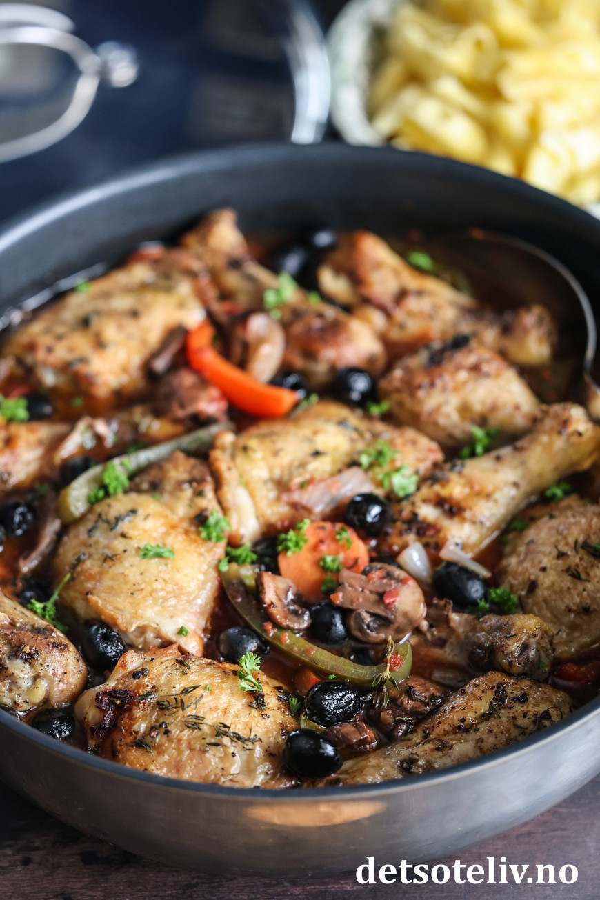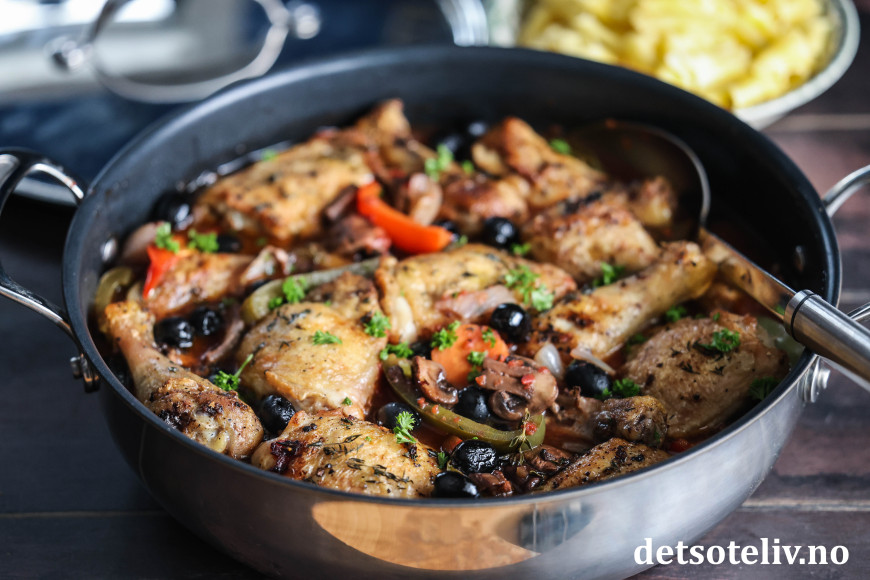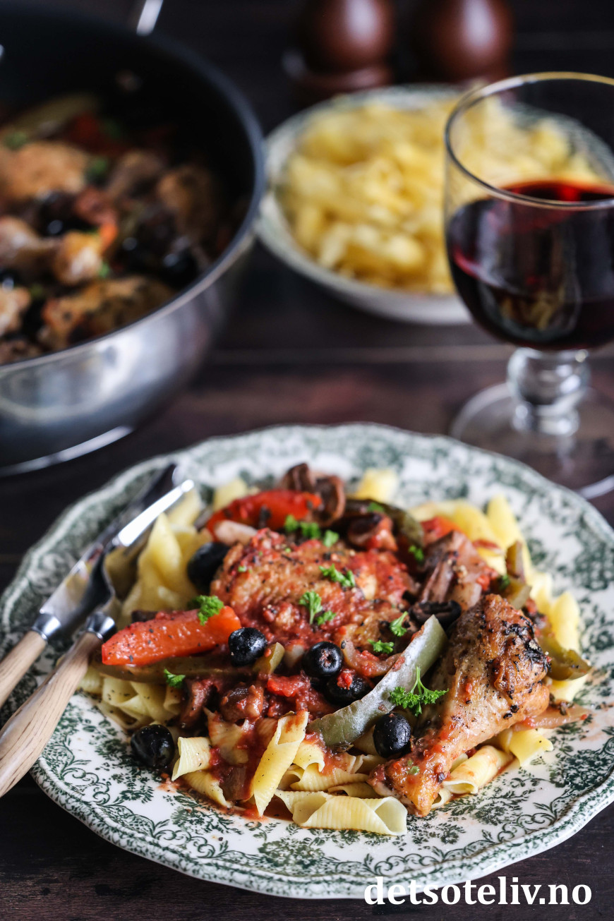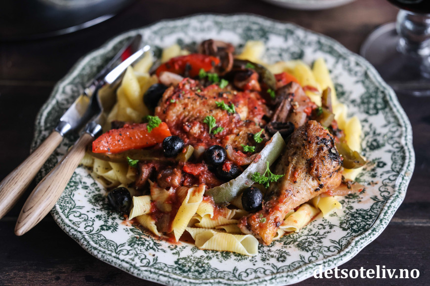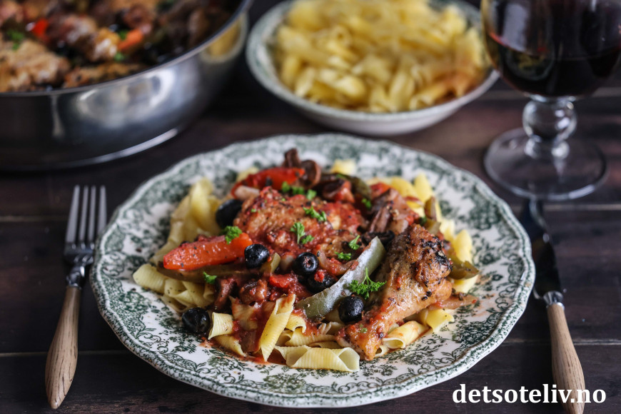"Cacciatore" betyr "jeger" på italiensk, og "Pollo alla cacciatore" dermed noe i retning av "kylling på jegerens måte". Typiske ingredienser i denne retten er, i tillegg til kylling, som regel sopp, løk, tomater, paprika, oliven, vin og urter. Bruk gjerne en hel kylling som du parterer i mindre stykker på jegers vis. 😃 Jeg valgte den enkle utveien ved å kjøpe kyllinglår, ferdig delt opp i overlår og kyllingklubber.