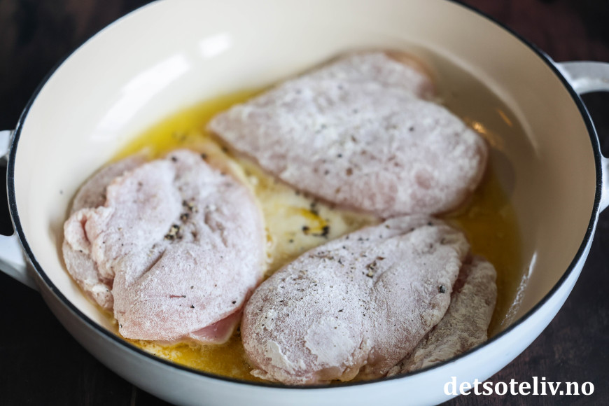 Ha hvetemel på en tallerken og vend kyllingfiletene i hvetemelet så de blir godt dekket på begge sider. Rist vekk overflødig mel.