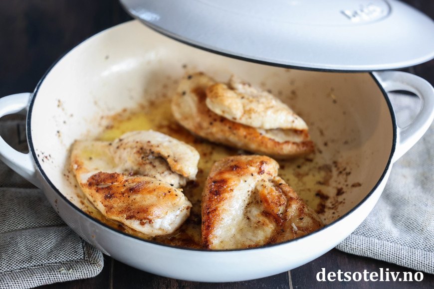 Finn frem en stor stekepanne med høye kanter. Ha 2 ss smør og 2 ss olje i pannen og stek kyllingfiletene så de blir gylne, får god stekeskorpe på begge sider og blir gjennomstekte inni (ca. 5 minutter på hver side).
