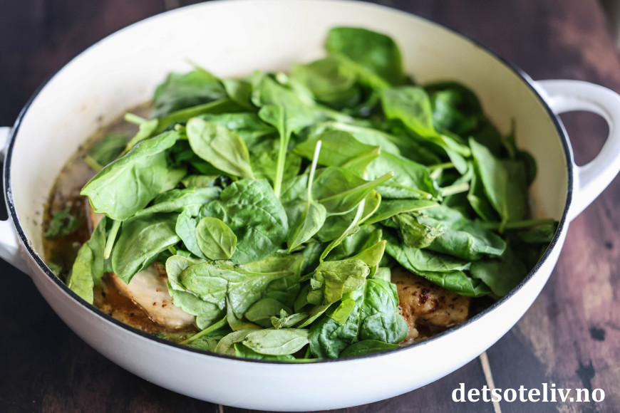 Legg kyllingfiletene tilbake i pannen og la dem småkoke i sausen i et par minutter. Legg spinat i pannen og rør til spinatbladene "klapper sammen" og blander seg med sausen.