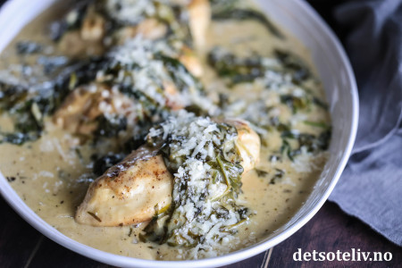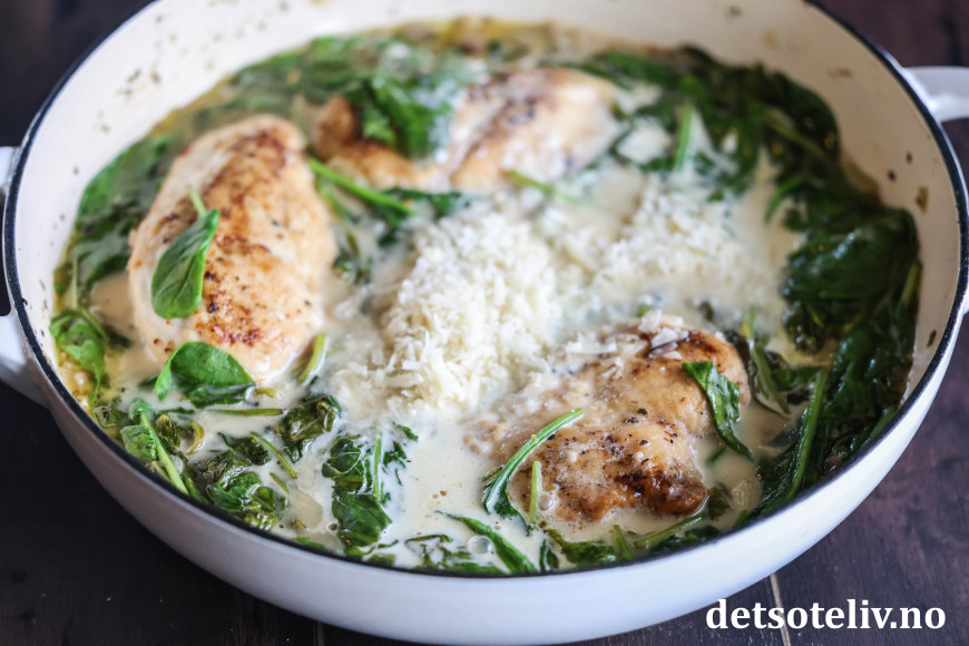 Legg kyllingfiletene tilbake i pannen og la dem småkoke i sausen i et par minutter. Legg spinat i pannen.
