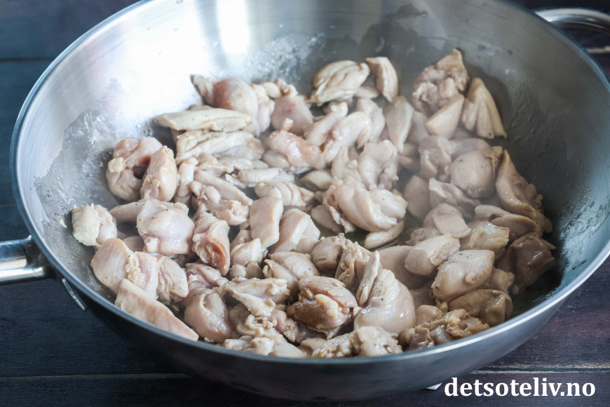 Finn frem en wok (eller panne med høye kanter) og ha ca. 2 ss olje i pannen. Kutt kyllinglårfiletene i mindre biter (jeg bruker en kjøkkensaks til dette og klipper bitene rett opp i woken).