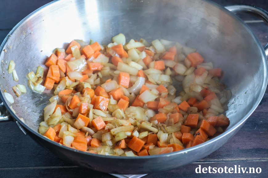 Ha litt mer olje i woken (ca. 1 ss) og tilsett oppkuttede gulrøtter, løk og hvitløk. La dette steke i noen minutter til løken er blank og gyllen.