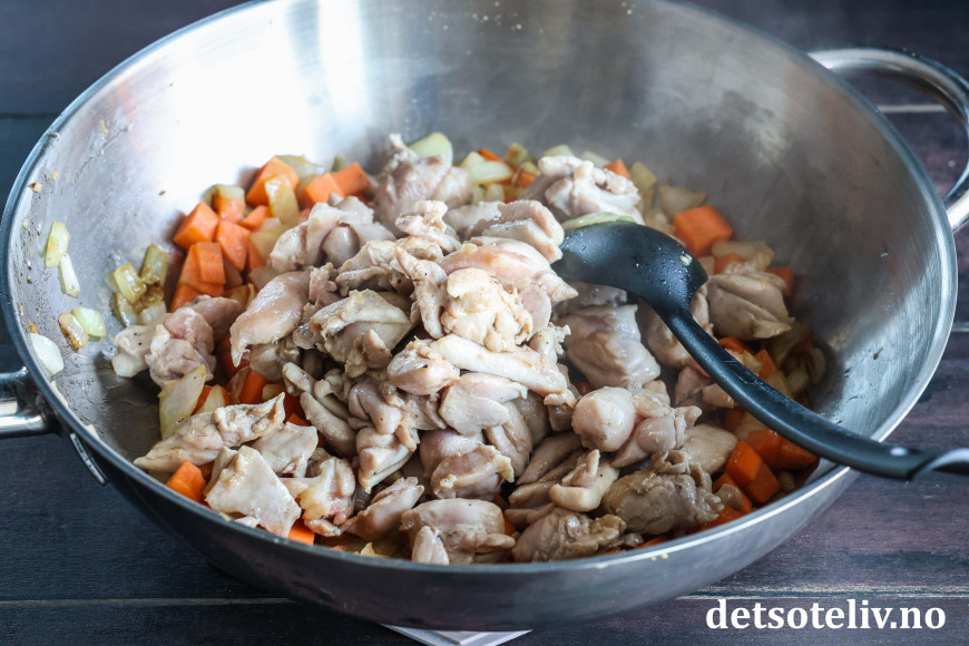 Ha de stekte kyllingbitene i woken, og la de steke sammen med grønnsakene i et par minutter, til de er helt gjennomstekte.
