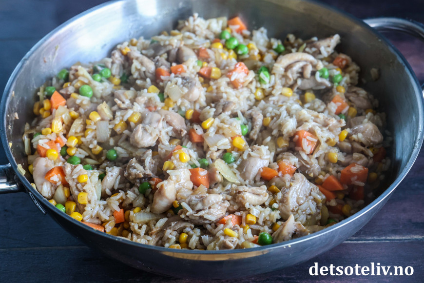 Hovedingrediensene er ris, stekt kyllinglårfilet og fluffy biter av eggerøre i tillegg til klassiske grønnsaker som gulrot, mais, erter, løk og vårløk. Det hele blandes sammen med en smakfull saus.