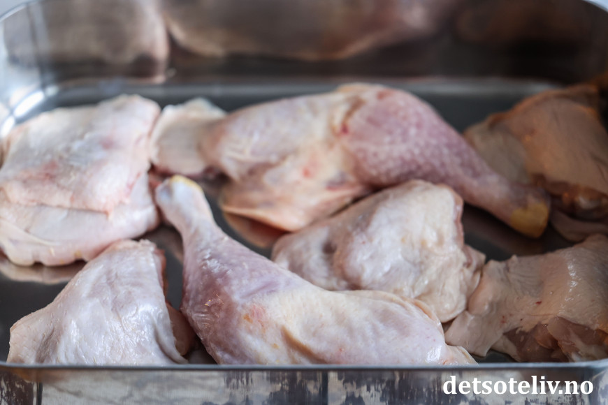 ♥ Jeg brukte her en kombinasjon av to hele kyllinglår (ca. 300 gram per stykk) og en pakke på 600 gram med kylling overlår (med skinn og ben). Du kan i stedet bruke bare hele kyllinglår eller bare overlår. Hvis du ikke har tid til å la kyllingbitene marinere over natten, går det greit med noen timer.