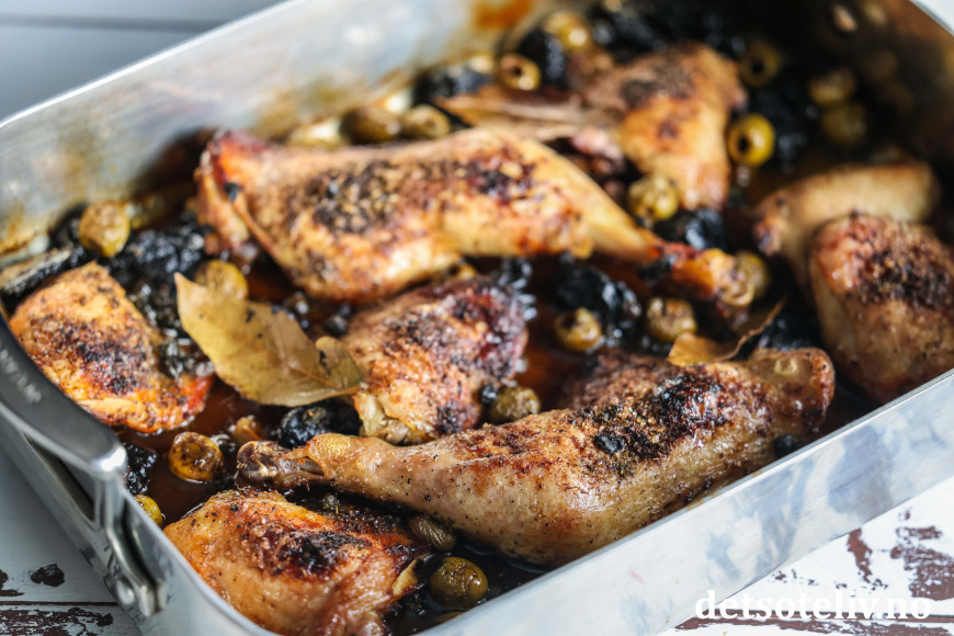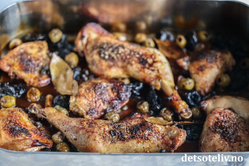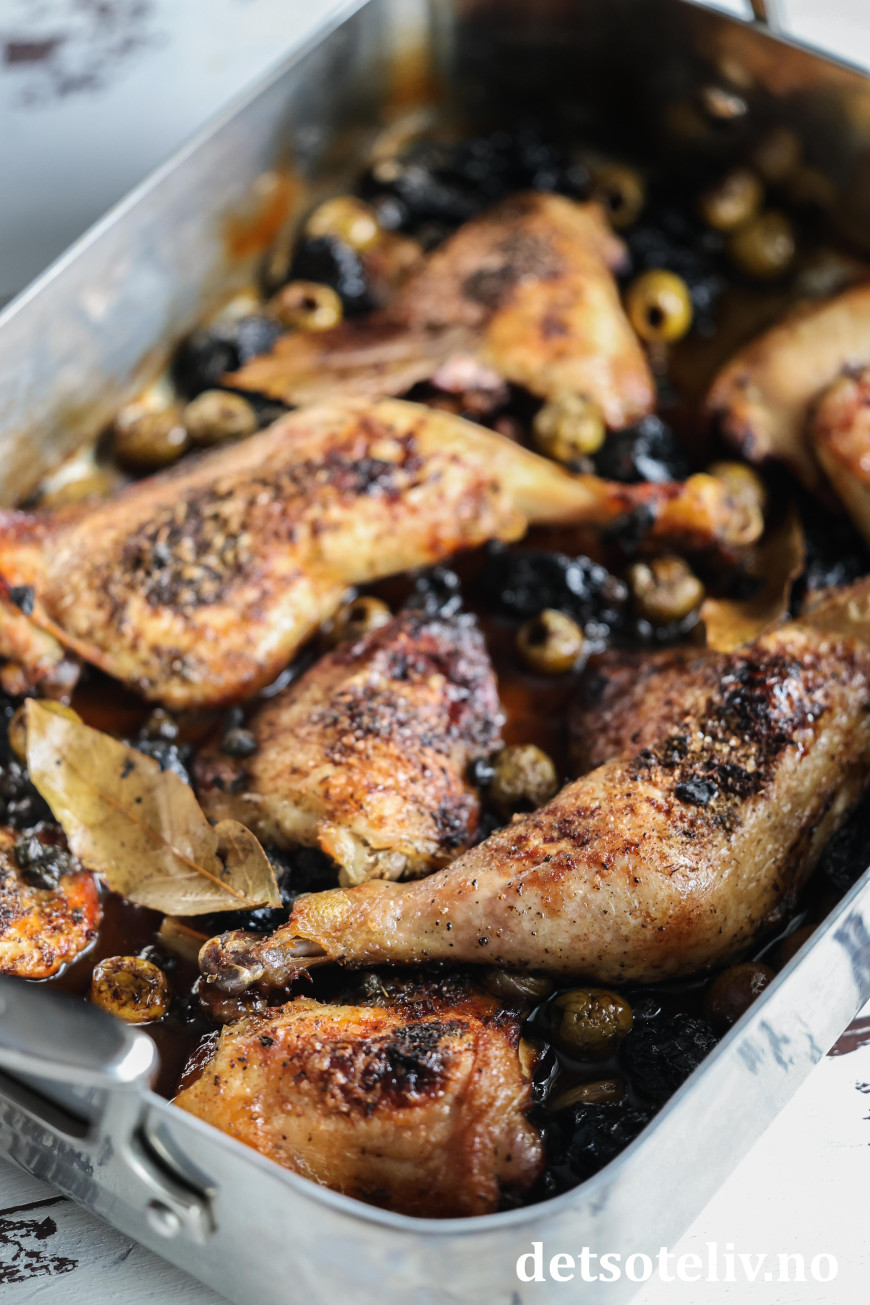 Skrell hvitløksfedd, knus dem lett og legg dem innimellom kyllingstykkene. Fordel svisker, oliven og kapers innimellom kyllingstykkene.