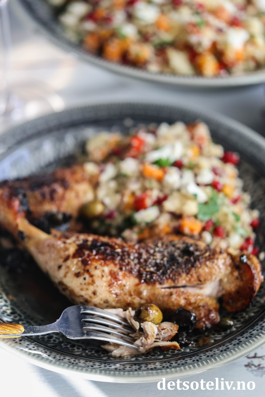 Chicken Marbella serveres gjerne sammen med stekte poteter, potetmos eller ris - men blir kanongod sammen med Couscous med ovnsbakte grønnsaker og feta.