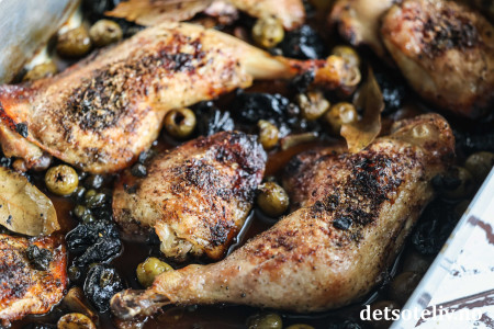 Chicken Marbella er den mest berømte retten fra denne kokeboken, og er en spennende kombinasjon av ovnsstekt kylling med oliven, kapers, svisker, hvitløk, hvitvin og brunt sukker. Det høres litt rart ut å blande salte og søte smaker med kylling på denne måten, men denne kyllingretten blir rett og slett uventet god!