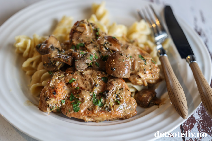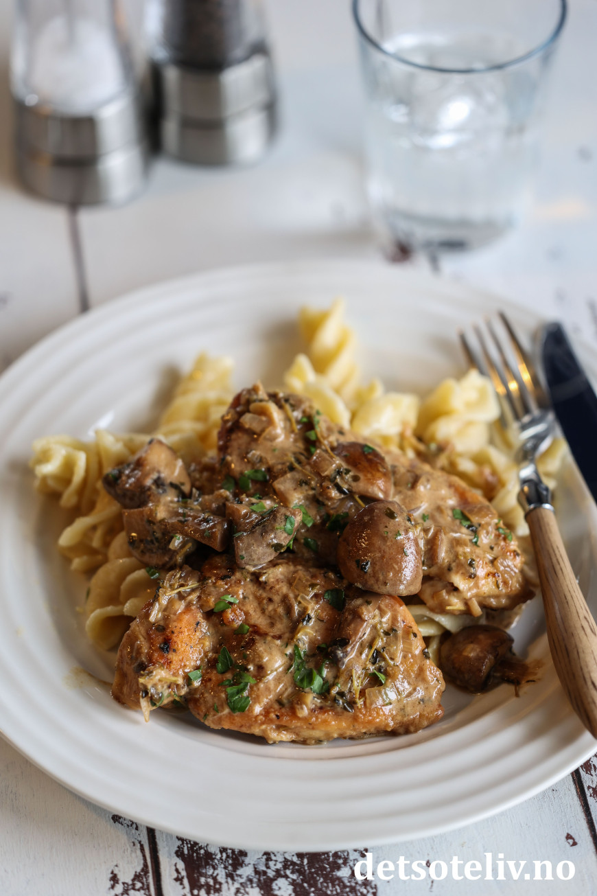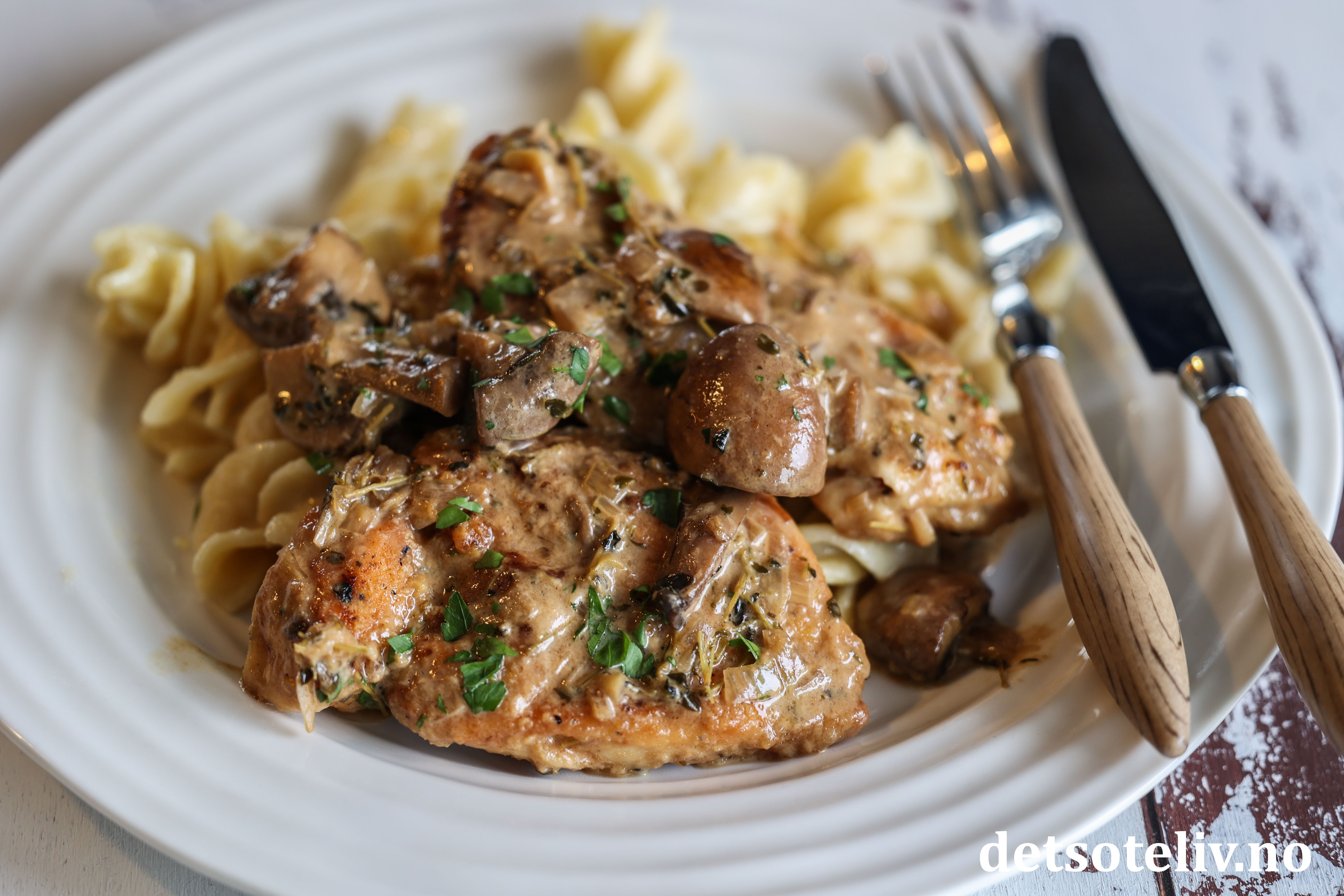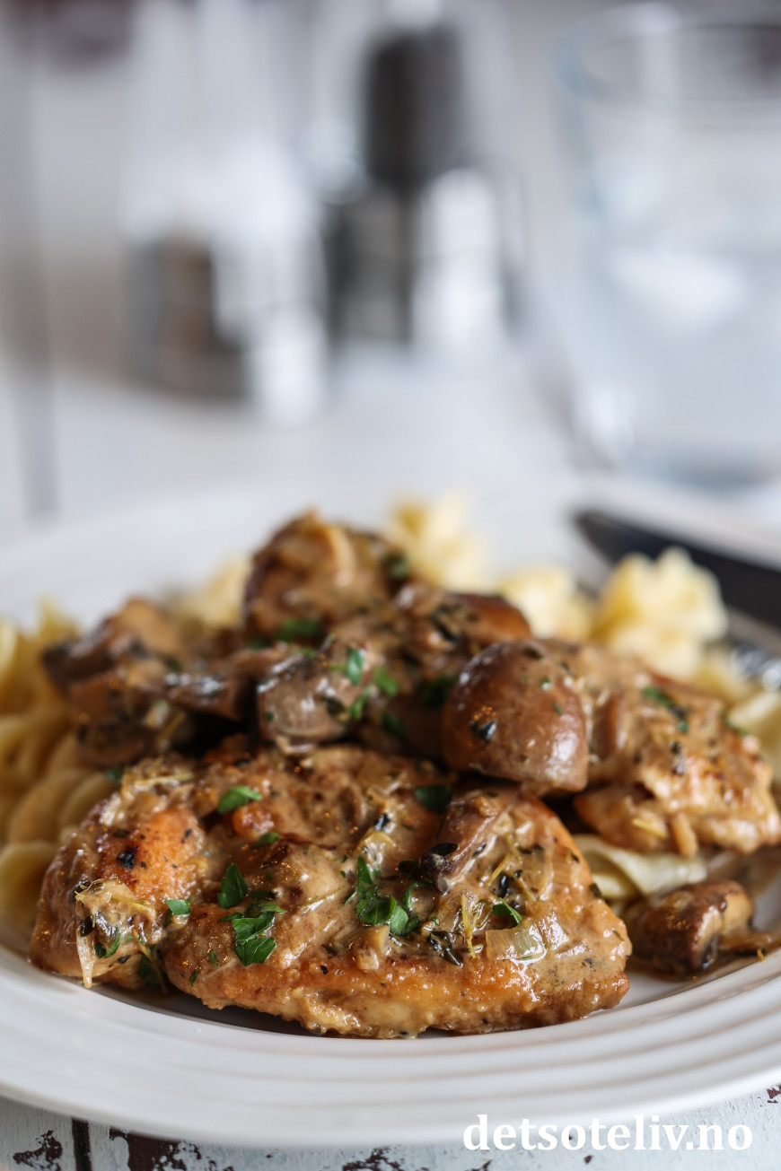 Chicken Marsala kan serveres sammen med ris, potetmos, spagetti eller superdigg Garlic Butter Pasta (Pasta med hvitløkssmør og parmesan).
