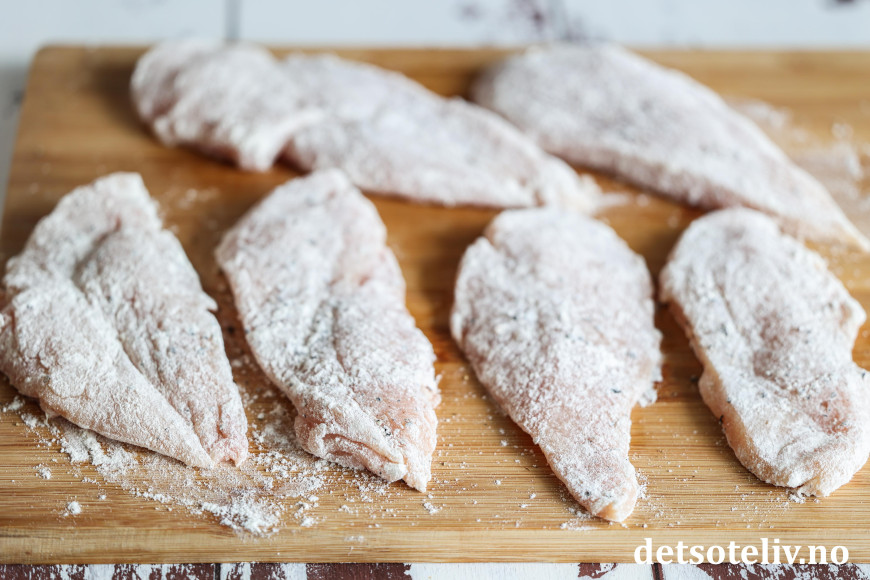 Ha hvetemel på en tallerken og vend kyllingfiletene i hvetemelet så de blir godt dekket på begge sider.