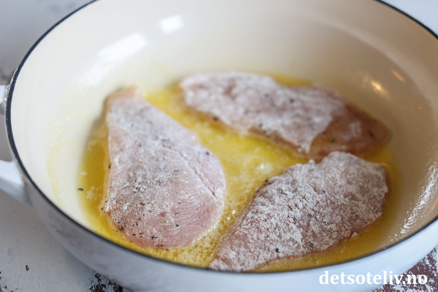 Ha hvetemel på en tallerken og vend kyllingfiletene i hvetemelet så de blir godt dekket på begge sider. Rist vekk overflødig mel. Gjør alle kyllingfiletene klare før du starter stekingen.