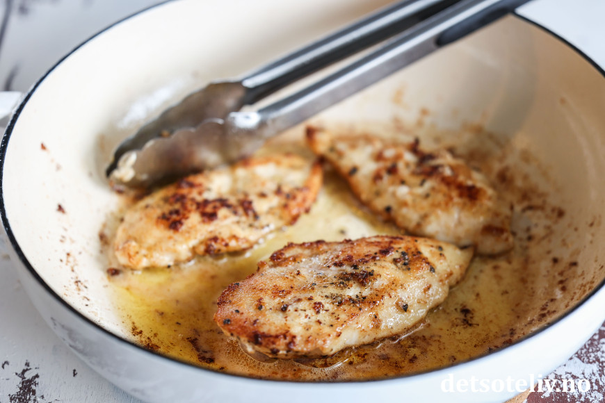 Finn frem en stor stekepanne med høye kanter. Ha 1 ss smør og 1 ss olje i pannen og stek halvparten av kyllingfiletene så de blir gylne og får god stekeskorpe på begge sider (ca. 8 minutter til sammen). Ta ut de stekte kyllingfiletene, tilsett en ny runde med 1 ss smør og 1 ss olje i pannen, og gjenta med resten av kyllingfiletene. Legg kyllingfiletene til side mens du tilbereder sausen (ikke vask stekepannen, men behold fettet fra stekingen av kyllingfiletene).
