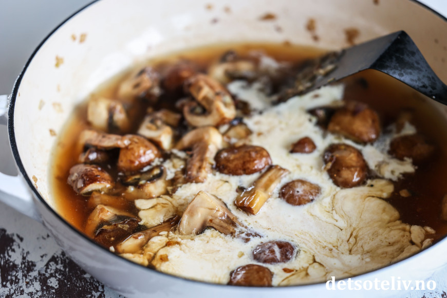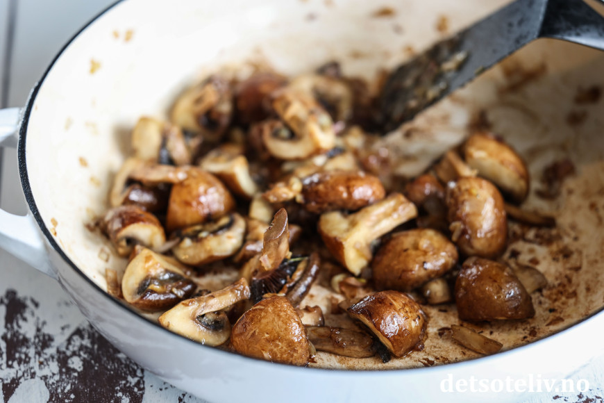 Ha fint hakket hvitløk og sjalottløk i pannen sammen med en ny ss smør. Skjær soppen i tykke skiver og ha i pannen.