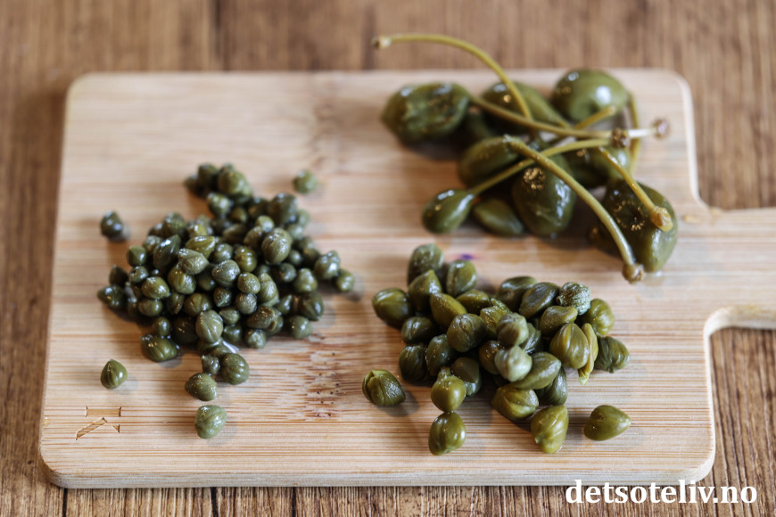 ♥ Noe av kjennetegnet med Chicken Piccata er kapers. Kapers kjøpes på glass og finnes i litt ulike størrelser, men smaken er den samme. Jeg brukte her mellomstore kapers, nede til høyre på bildet nedenfor.