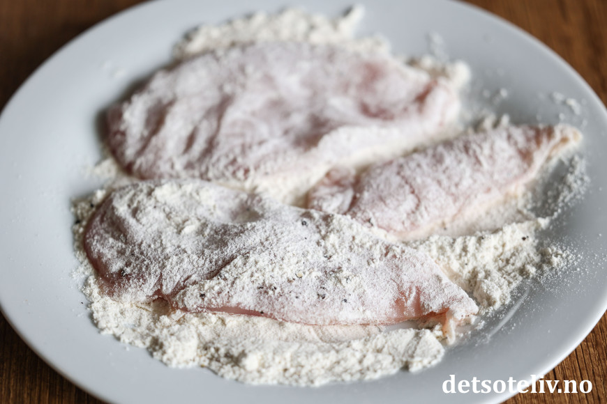 Ha hvetemel på en tallerken og vend kyllingfiletene i hvetemelet så de blir godt dekket på begge sider.