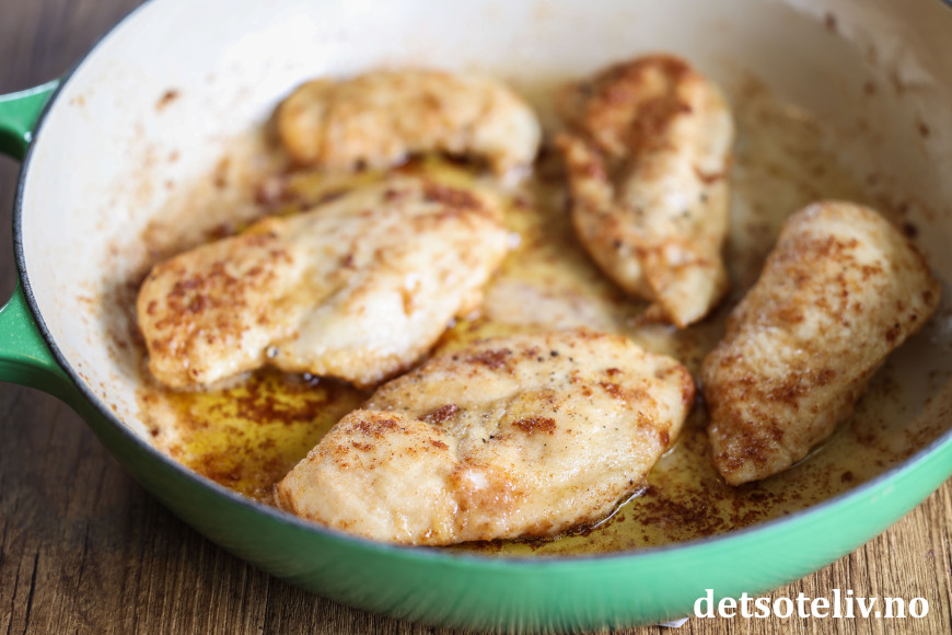 Legg kyllingfiletene til side mens du tilbereder sausen (ikke vask stekepannen, men behold fettet fra stekingen av kyllingfiletene).