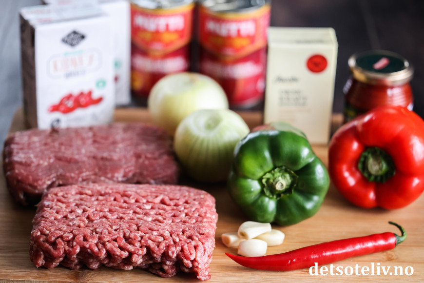 Chili con carne (som betyr "chili med kjøtt" på spansk) er en kjempepopulær gryterett, som opprinnelig stammer fra Texas i USA, selv om den helt klart er inspirert av det meksikanske kjøkkenet. Den beste versjonen lages med store biter mørt, langtidskokt oksekjøtt, men denne raske varianten som lages med kjøttdeig og karbonadedeig er også veldig god! Chili con carne kan også lages med kylling (Chili con pollo) og uten kjøtt (Chili sin carne).