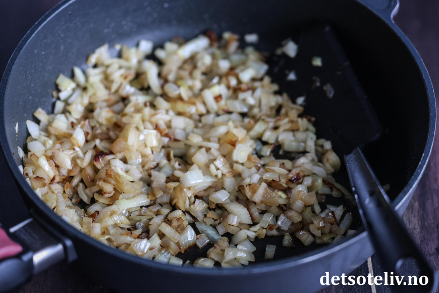 Ha litt mer olje i pannen. Hakk løk og hvitløk og stek dette i pannen til løken er blank og gyllen.