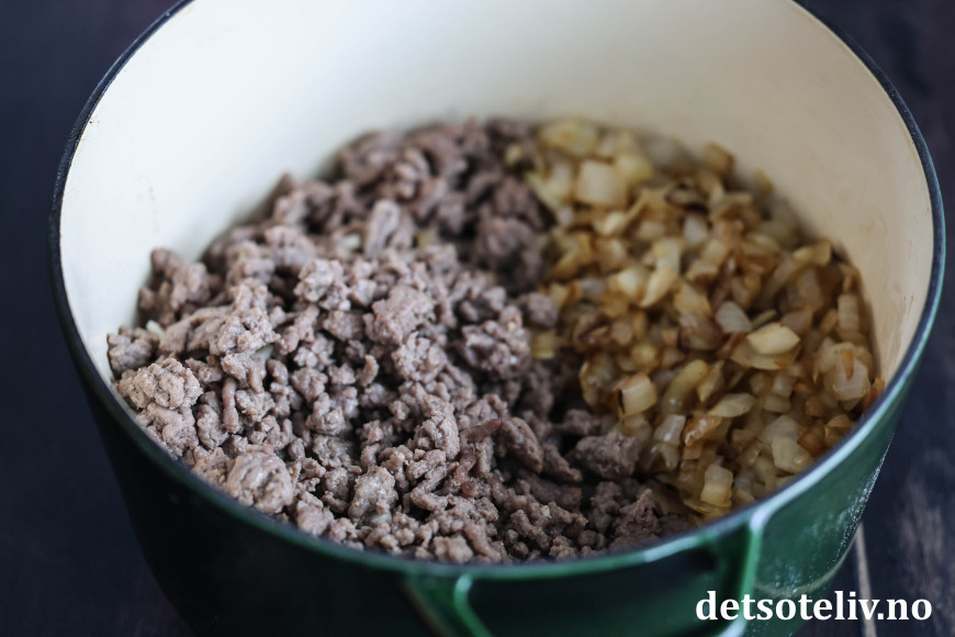 Stek kjøttdeig og karbonadedeig i en panne sammen med et par skjeer olje. Krydre kjøttet med kvernet salt og pepper. Ha den stekte kjøttdeigen deretter i en gryte.