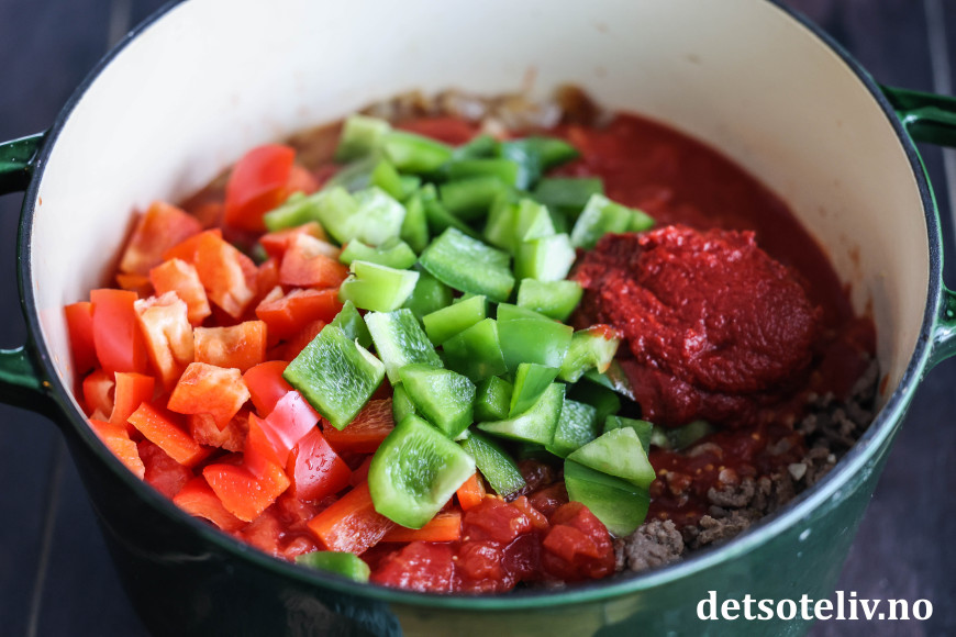 Tilsett hakkede, hermetiske tomater, tomatpuré, kjøttkraft og rød og grønn paprika, som er renset og skjært i mindre biter.
