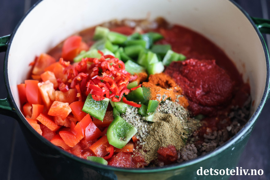 Rens fersk chili for frø (se tips) og finhakk ønsket mengde. Ha dette i gryten sammen med krydderet (kajennepepper, spisskummin, paprikapulver, oregano og merian).