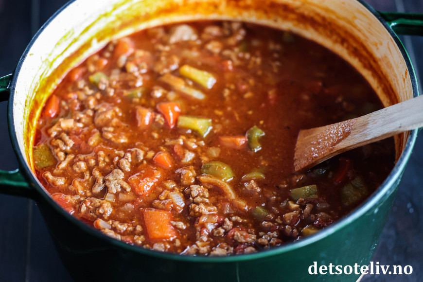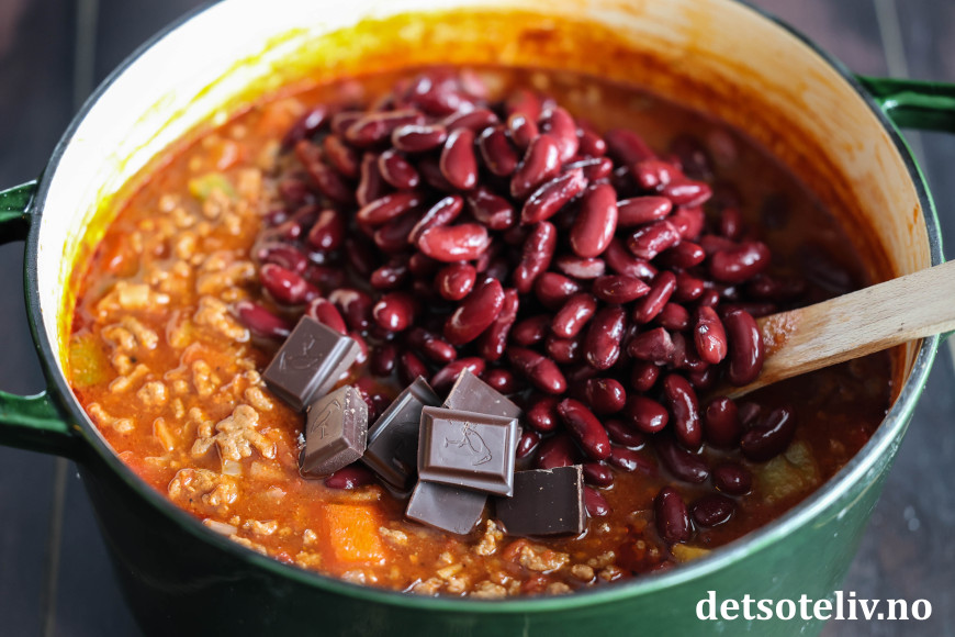 Gryteretten for øvrig består av løk, hvitløk, tomat, paprika, kidneybønner og masse herlig krydder. Mengden chili kan man tilpasse alt ettersom hvor sterk man liker maten, men litt chili bør det være i en Chili con carne. 😊 En annen viktig ingrediens i en autentisk Chili con carne er noen ruter mørk sjokolade, som tilfører gryteretten både litt sødme og dybde, men uten at gryten smaker sjokolade så klart.