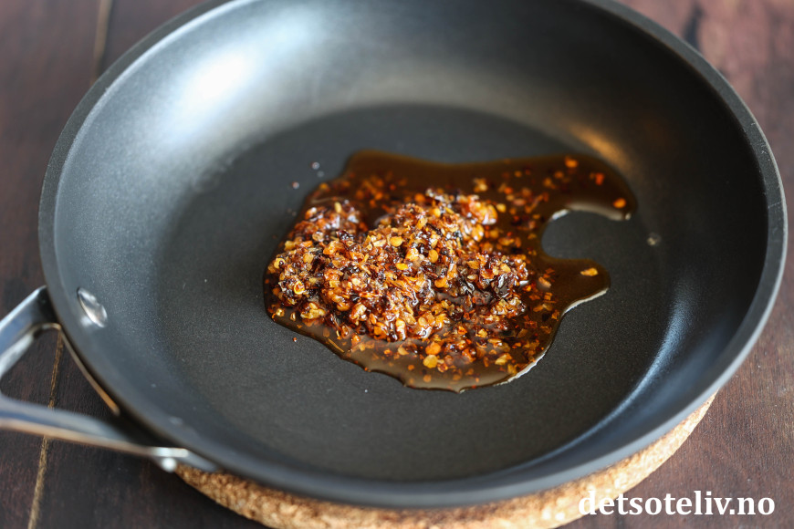 Finn frem en teflonbelagt stekepanne. Bruk gjerne en liten stekepanne hvis du har (pannen jeg brukte her er bare 20 cm i diameter). Ha Chili Crisp og eventuelt litt sesamolje i pannen og varm opp litt.