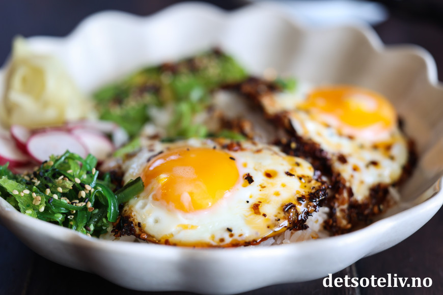Legg de stekte eggene oppå en skål med varm jasminris. Drypp over litt soyasaus. Topp deretter med for eksempel en halv avokado, finhakket vårløk, reddik i tynne skiver, litt syltet ingefær og wakame (sjøgress-salat) hvis du liker det. Ha litt ekstra Chili Crisp på avokadoen og eggene hvis du vil. Dryss over sesamfrø.