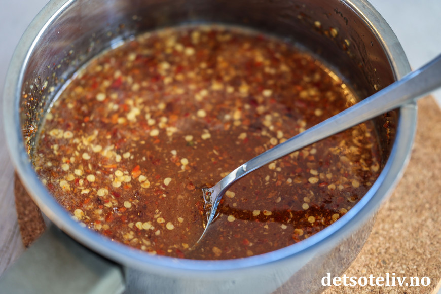 ♥ Jeg har her tilsatt litt amerikansk / meksikansk Hot Sauce i tillegg til chiliflak. Hot Sauce fås kjøpt i velassorterte matbutikker, og bidrar både med litt ekstra styrke og rødfarge på honningen. Du kan alternativt tilsette annen type chilisaus eller chilipulver. Dette er imidlertid ikke nødvendig, og du kan fint holde deg til bare chiliflak.