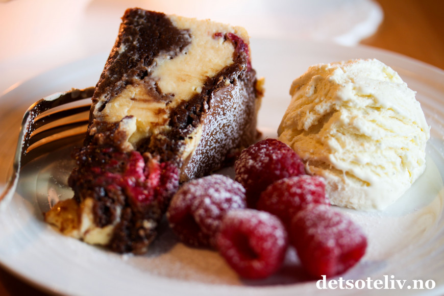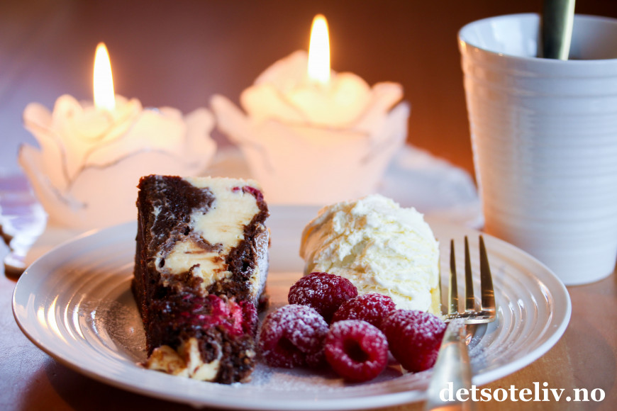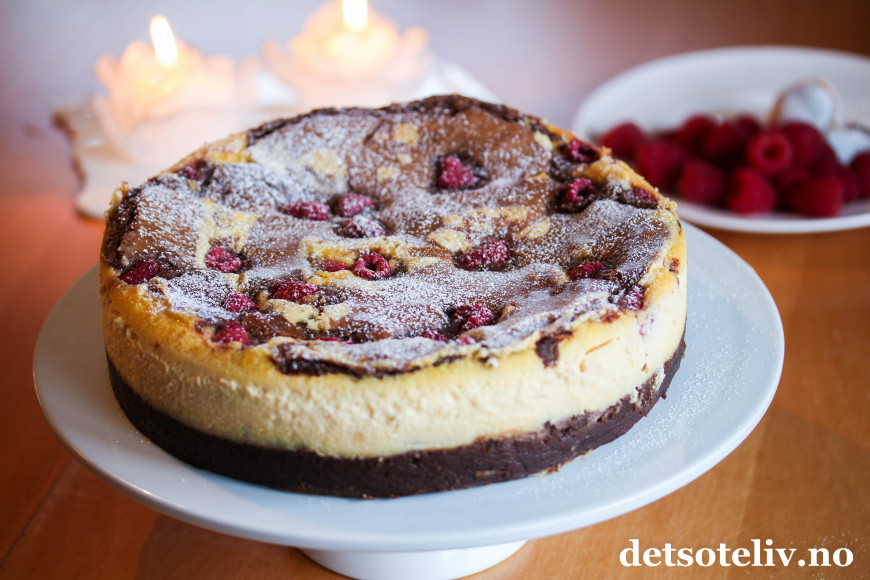 Kaken består av både mørk sjokoladebrownie og stekt ostekake blandet om hverandre, og blir temmelig mektig. Bringebærene gjør imidlertid at kaken likevel får en søt friskhet over seg.