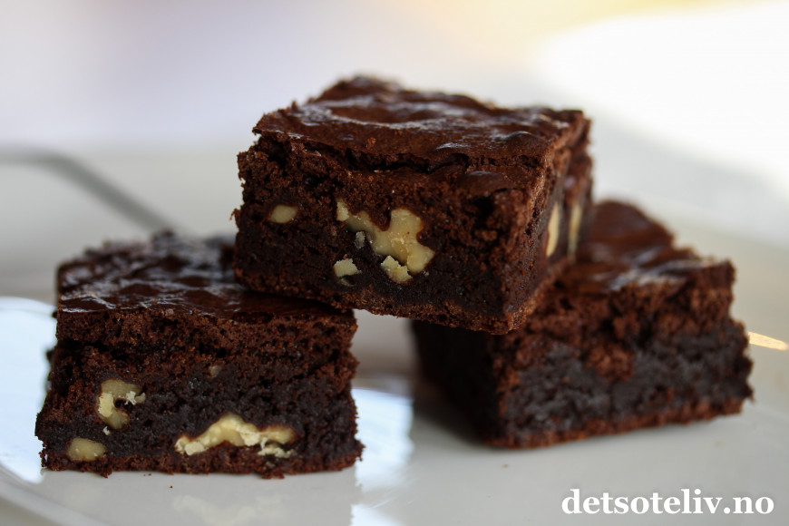 Denne oppskriften på “Chocolate Brownies” er noe av det beste jeg har her på Det søte liv! Deigen inneholder nesten ikke noe mel, hvilket gir brownies med fantastisk konsistens og smak! Til gjengjeld er det mye smør i disse browniesene. Og mye mørk sjokolade. Og mye sukker og mye valnøtter. Mye av alt egentlig. Bortsett fra mel da, som sagt. Men moderasjon er jo for kjipinger...