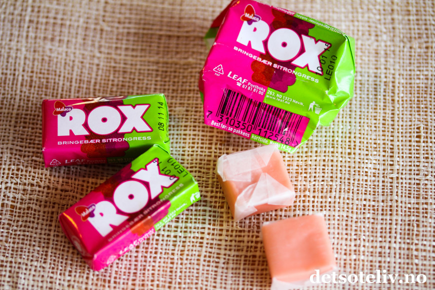 ♥ Rox er myke, rosa karameller med bringebærsmak som fås kjøpt i de fleste velassorterte matvarebutikker og kiosker. Det er 2 stk karameller i hver pakke, så du trenger altså 5 pk Rox til denne oppskriften.