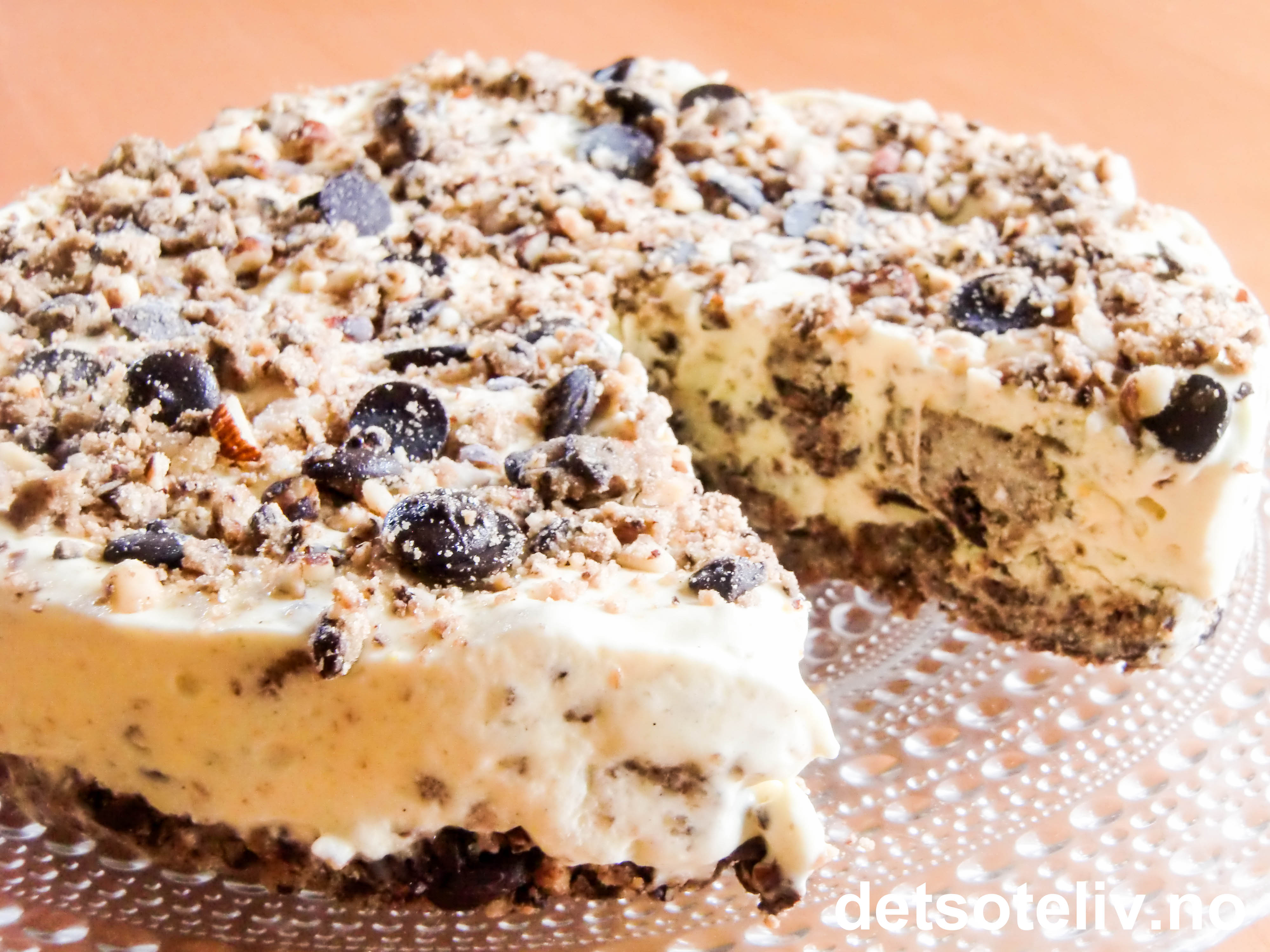 Strø over litt cookiesdeigsmuler og litt mer hakket kokesjokolade. Sett formen i fryseren til kaken er frossen (minst 5 timer og gjerne over natten).