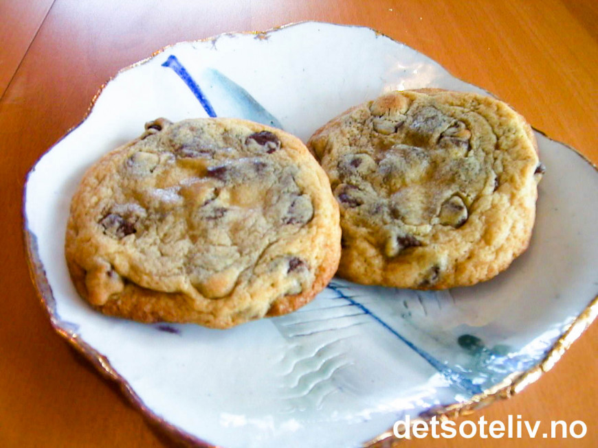 Min datter på 14 år bakte disse, hun byttet ut chocolate chips'ene med Freia melkesjokolade, og du store min, dette er de beste cookies jeg noen gang har smakt!!