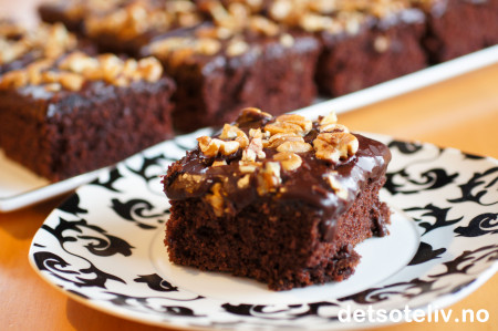 Hell deigen i en stor, bakepapirkledd langpanne (ca 30x40 cm). (La bakepapiret stikke litt opp langsmed sidene, slik at det blir lett å løfte kaken ut av formen.) Stek kaken midt i ovnen ved 175°C i ca 40-50 min (sjekk med kakenål).