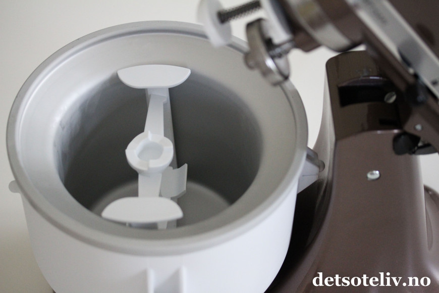 Finn frem den frosne iskrembollen og monter den på kjøkkenmaskinen. Det er superenkelt! Bare sett iskrembollen på maskinen som om det hadde vært en rørebolle, legge rørebladene i bollen og skyv på plass festet. Senk maskinen slik at festet og røredelen går mot hverandre. Vips har du forvandlet din kjøkkenmaskin til en iskremmaskin!