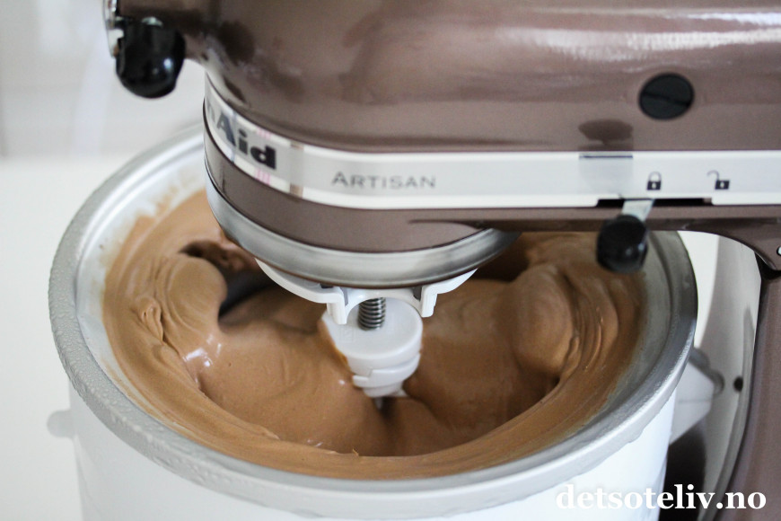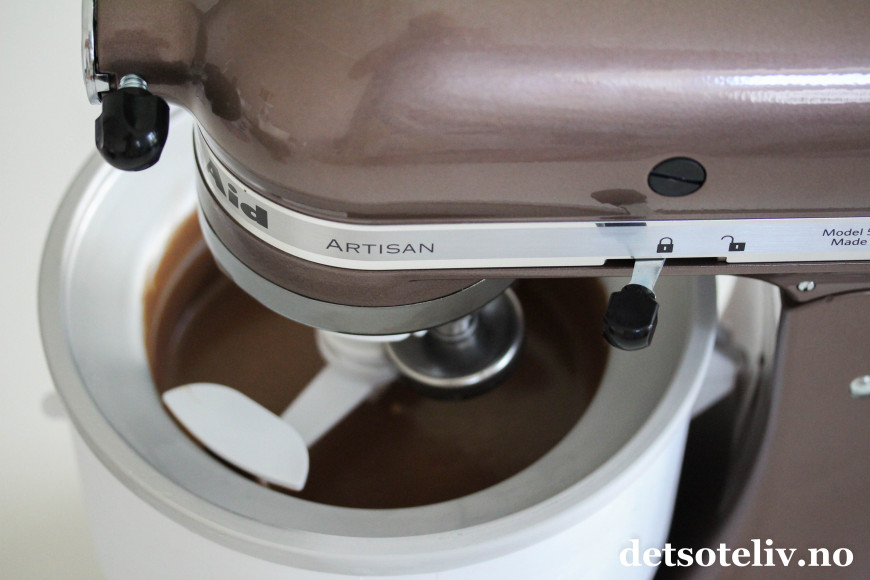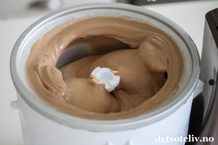 La maskinen gå i 25 minutter. Sjokoladeblandingen vil da ha blitt til en bløt mykis.