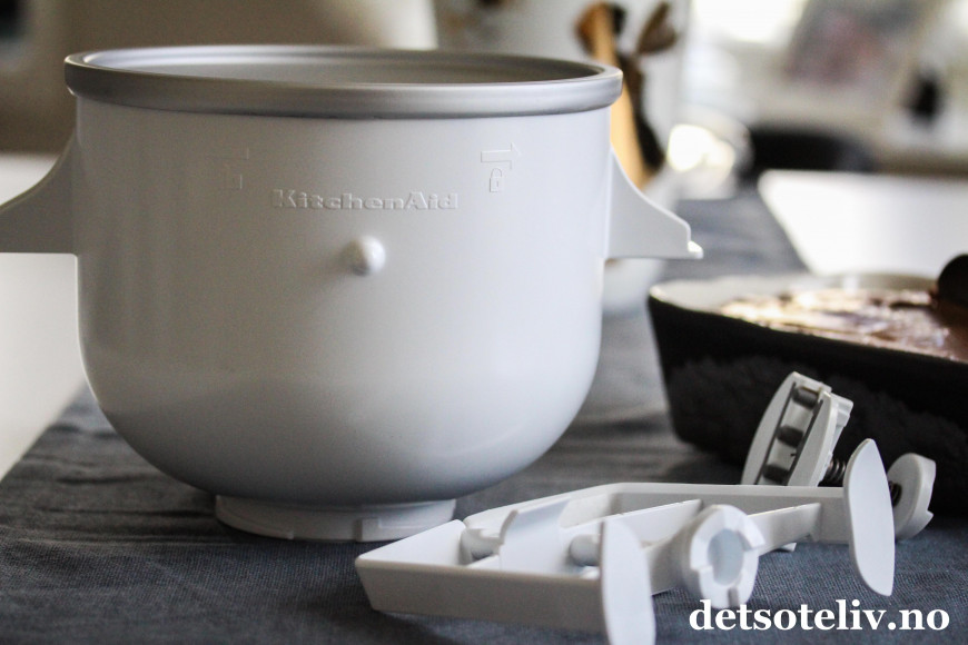 Har du en KitchenAid kjøkkenmaskin, finnes det utrolig mye tilbehør man kan få kjøpt, se blant annet veldig godt utvalg i nettbutikken til Bakeren og Kokken. Blant dette tilbehøret finner du en KitchenAid Icecream Maker, som du bruker på samme måte som en vanlig rørebolle. Veldig enkelt!