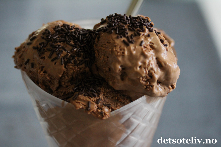 Så er det bare å scoope seg noen deilige iskremkuler! Dryss gjerne på sjokoladestrøssel for enda mer sjokolade!