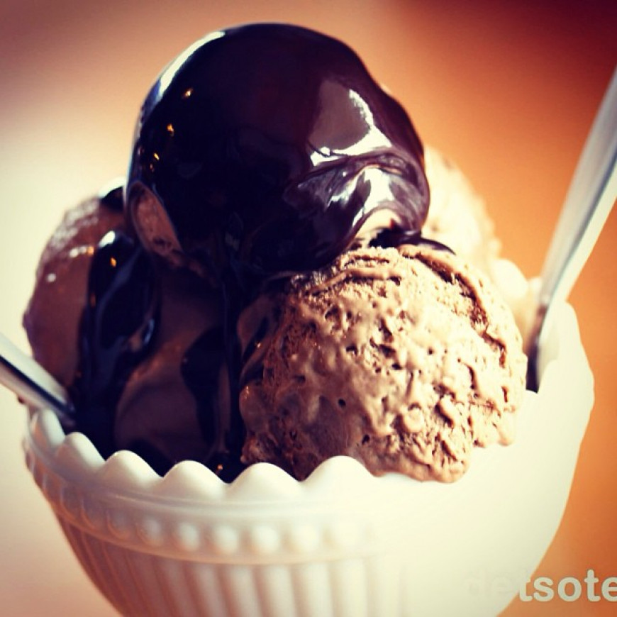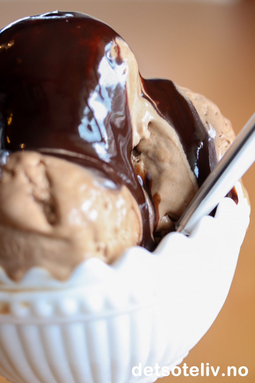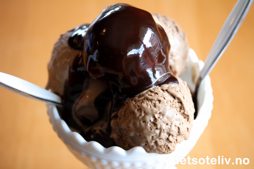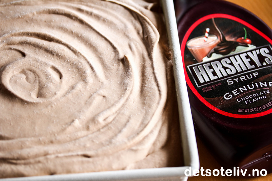 ♥ Jeg har brukt den amerikanske sjokoladesausen fra Hershey's til denne iskremen. Denne sjokoladesausen fås kjøpt i mange norske matbutikker, blant annet hos Meny, Ultra, Ica og Coop Mega.