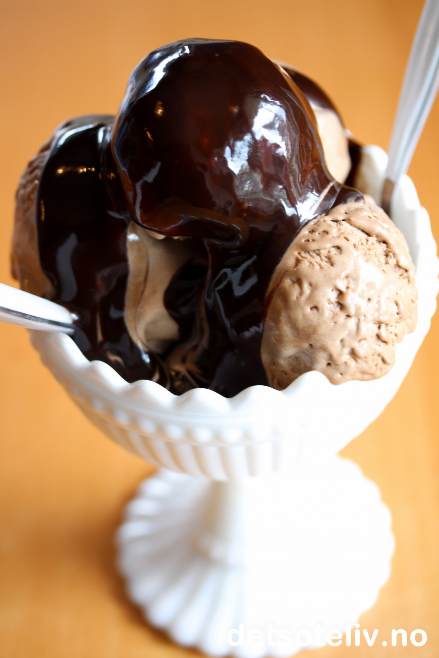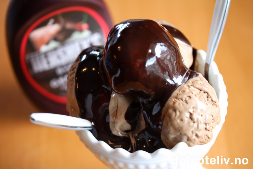 ♥ Jeg har brukt den amerikanske sjokoladesausen fra Hershey's til denne iskremen. Denne sjokoladesausen fås kjøpt i mange norske matbutikker, blant annet hos Meny, Ultra, Ica og Coop Mega.