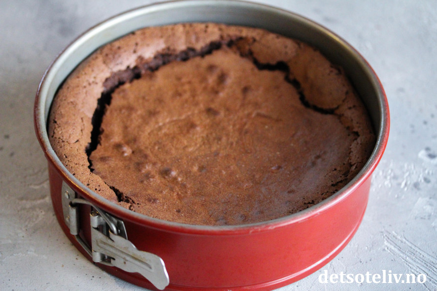 ♥ Kaken vil fortsatt kjennes bløt og litt ustekt når den tas ut av ovnen. Det er også helt normalt at den synker litt sammen i midten ved avkjøling. La kaken stå i kjøleskapet over natten før du tar den ut av formen. Da vil kaken blir stivere og lett å få ut av formen uten at den går i stykker.